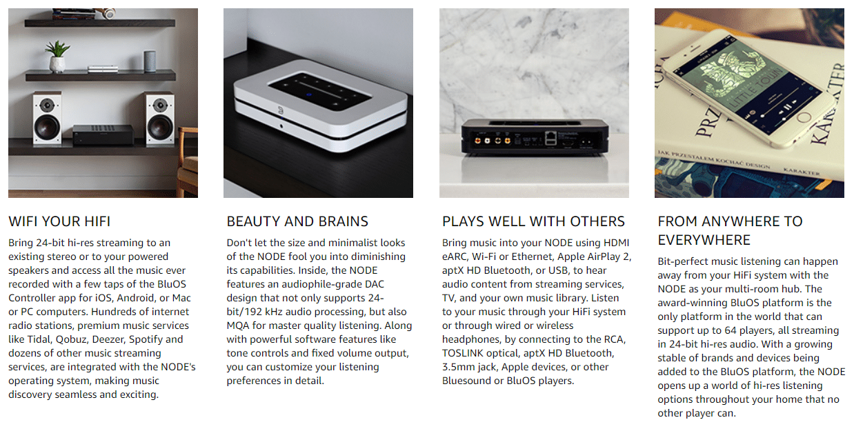 The Bluesound NODE unlocks the world of hi-res music streaming and multi-room audio to create a modern addition to existing HiFi systems or your favorite set of powered speakers. Discover all the music ever recorded with access to hundreds of internet radio stations, dozens of streaming music services, or even your own digital music library, with a few taps of the BluOS Controller app for iOS, Android, or Mac or PC computers.